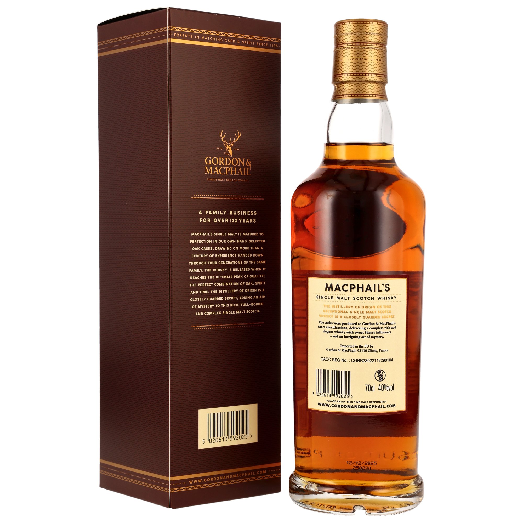 Die Herkunftsbrennerei dieser Single Malts ist streng geheim. Völlig klar ist dagegen: In der MacPhail’s Range erwartet Feinschmecker Hochgenuss aus Expertenhand zu einem absolut fairen Preis. Für die „msytery malts“ verbindet das schottische Traditionsunternehmen Gordon & MacPhail Whisky aus seiner Heimat, der Speyside, mit Fässern, die exakt nach den Vorgaben des Hauses gebaut wurden.